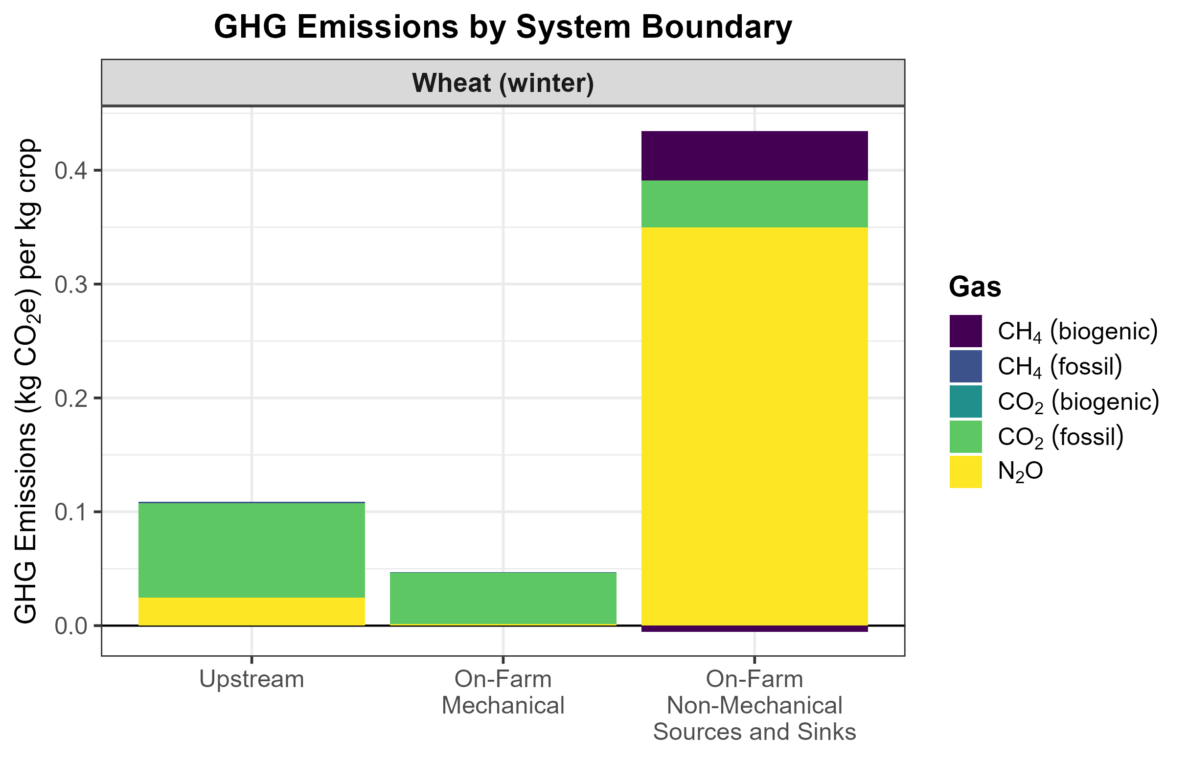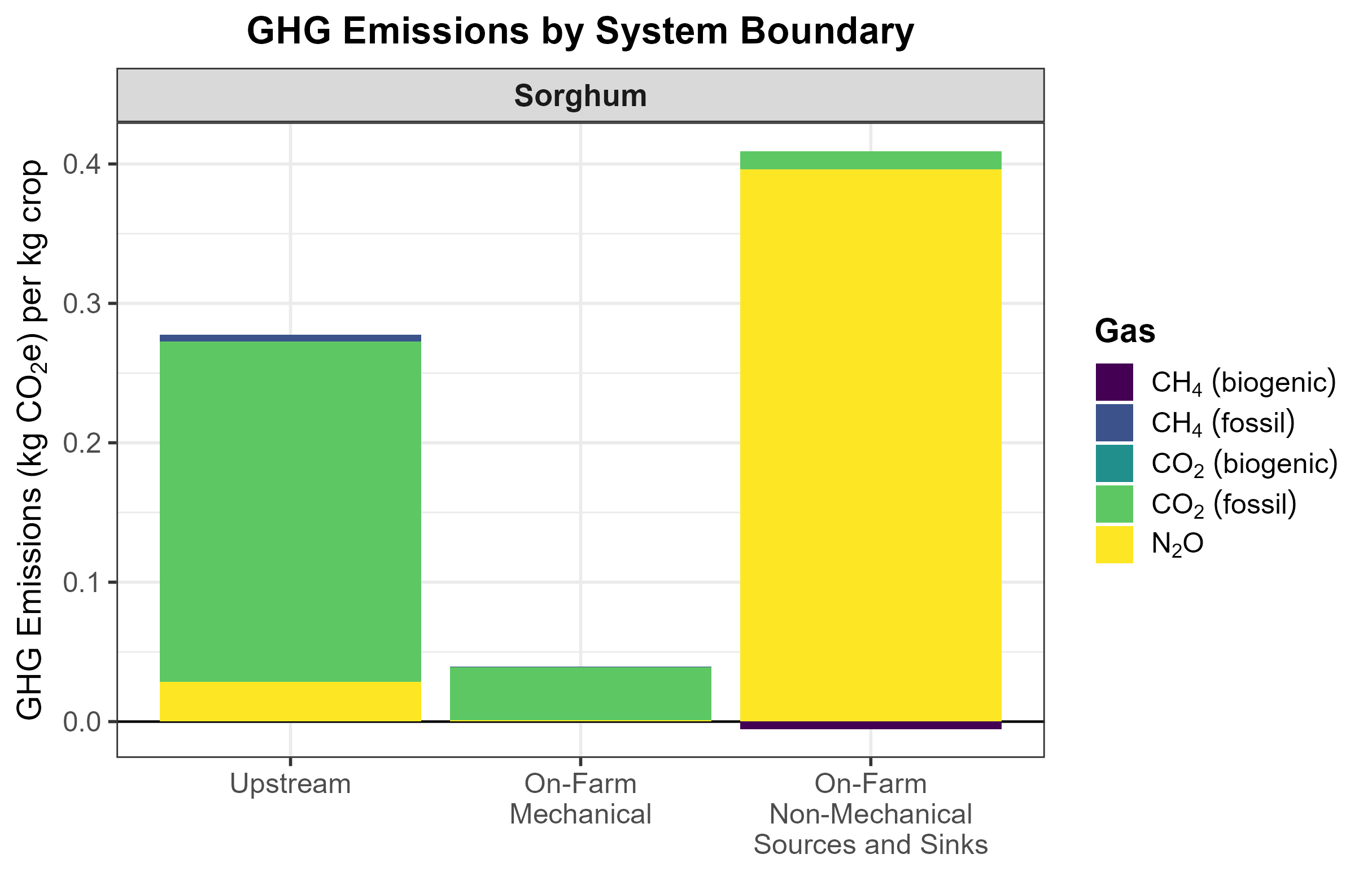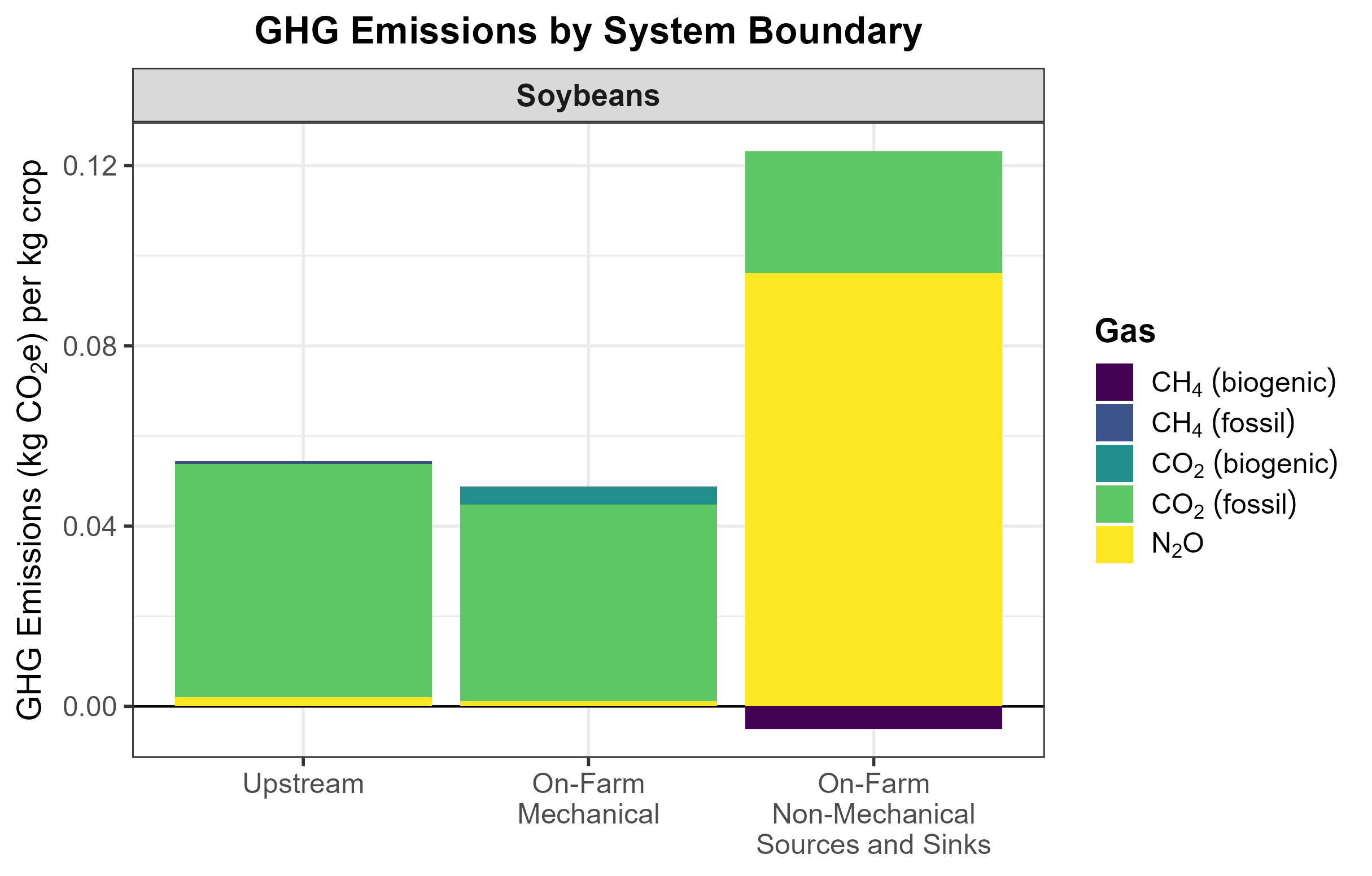 - 39% of GHG emissions are coming from soil N2O. Although there were no applications of N fertilizer, the soil N2O model considers crop residue as another input that can result in a release of N2O emissions.