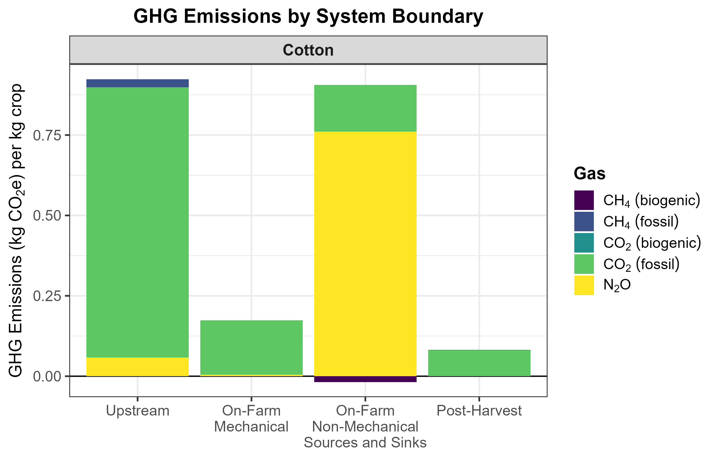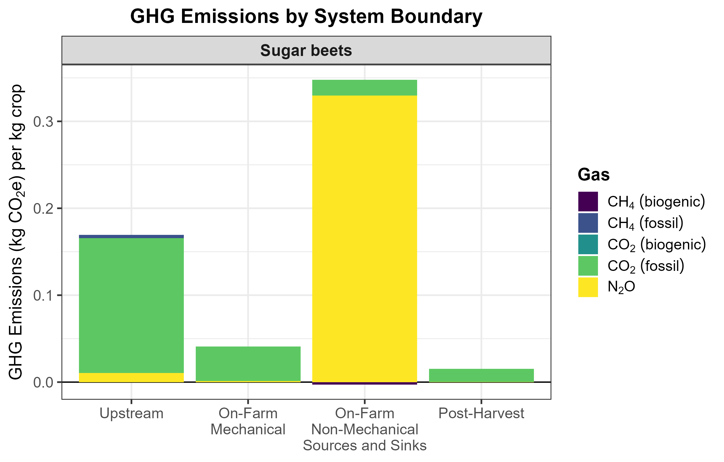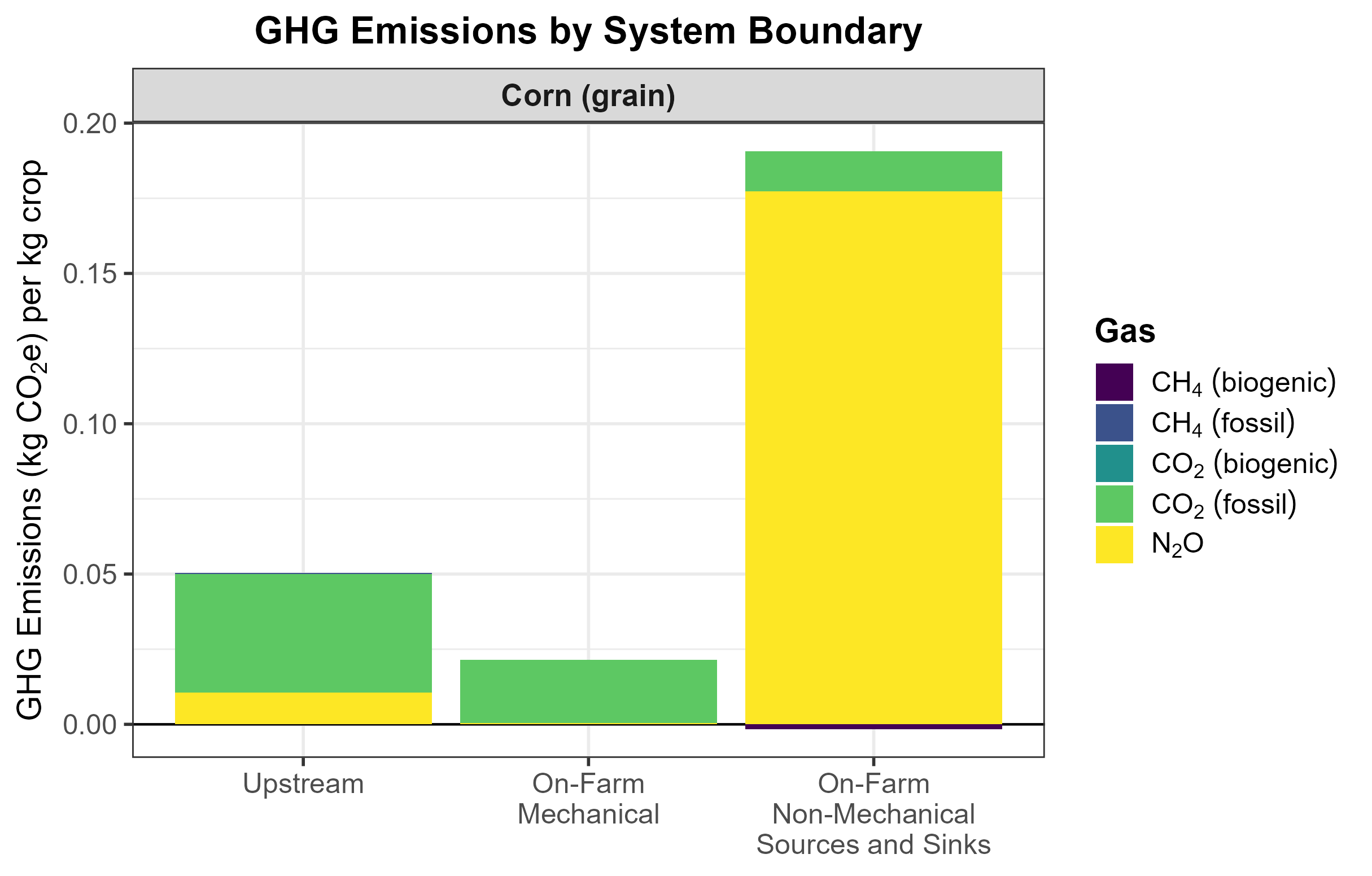 - 39% of GHG emissions are coming from soil N2O. Although there were no applications of N fertilizer, the soil N2O model considers crop residue as another input that can result in a release of N2O emissions.