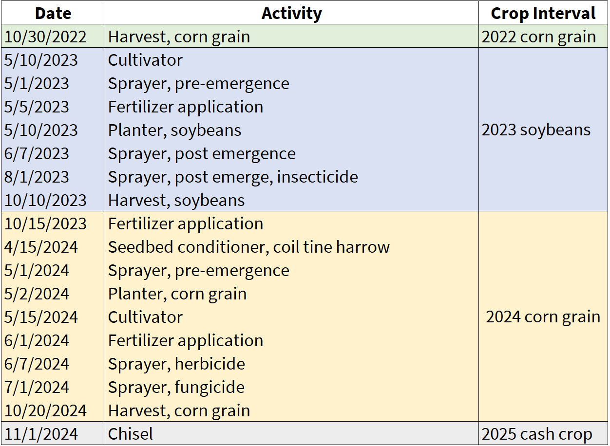 In Case 1, the energy use and GHG emissions associated with the field activities after the harvest of the 2022 corn grain are attributed to the 2023 soybean crop, the energy use and GHG emissions associated with the activities after harvest of soybeans are attributed to the 2024 corn crop, and so on. For the two crops with complete information shown above, the crop intervals would be delineated as follows: