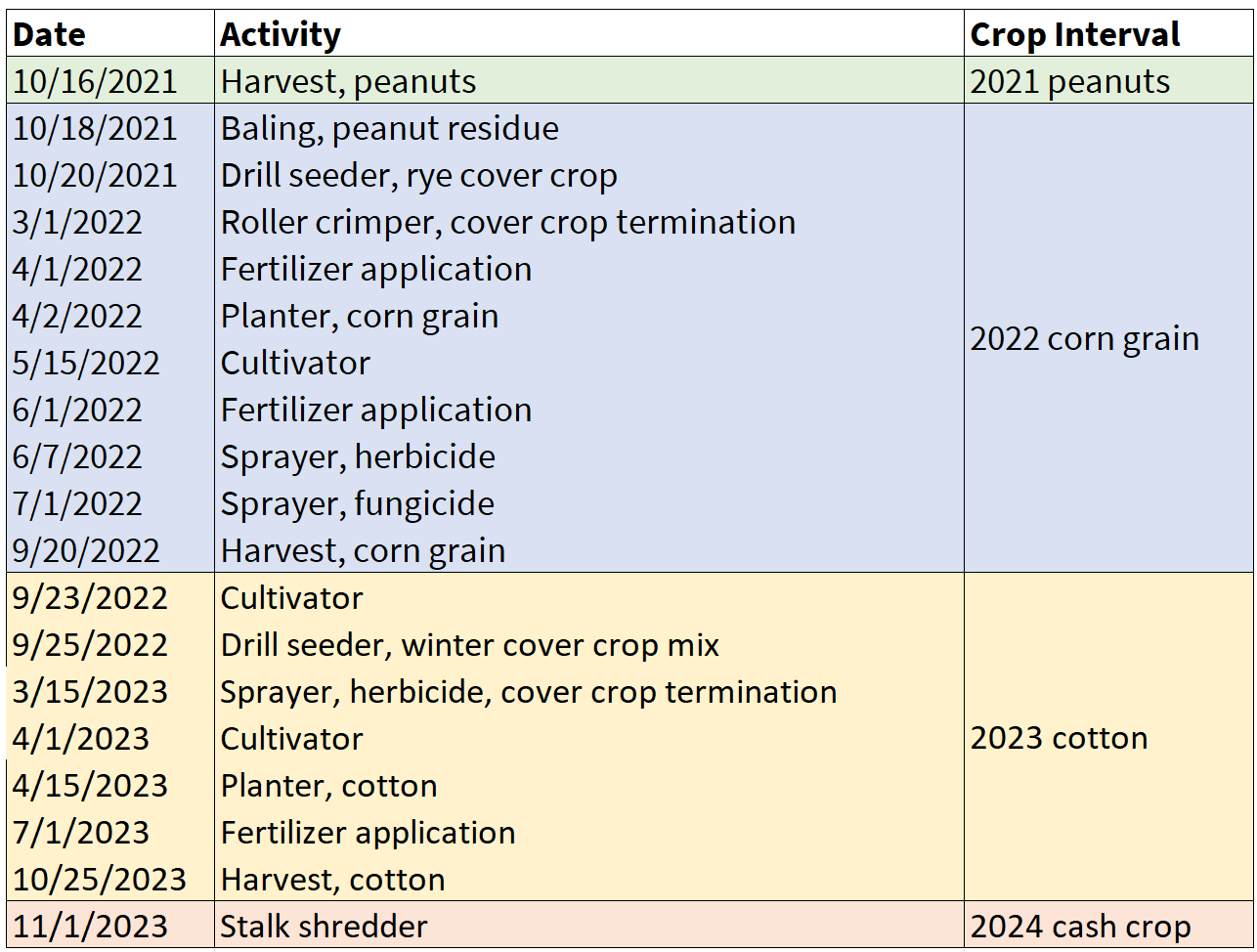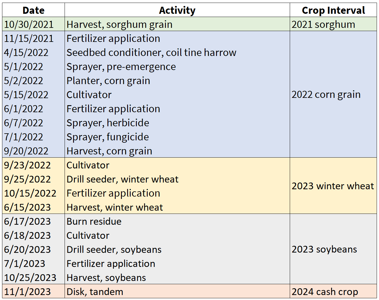 A crop interval starts after the last day of harvest of the previous cash crop and ends with the harvest of the next cash crop. Crop drying is included in the crop interval regardless of when the drying operation is conducted. A crop interval might start on the same day of harvest when there is a field operation on that day (stalk shredding, tillage, etc.); otherwise, the crop interval starts on the day after harvest. The energy use and GHG emissions associated with on-farm and field activities that occur during the crop interval are attributed to the cash crop being produced. Crop intervals typically straddle calendar years; however, there are some exceptions, such as short-season double-crops. Crop intervals are named using the crop name and harvest year or month-year of harvest. For example, a crop interval for cotton harvested in 2023 would be named 2023 cotton or 2023-10 cotton to specify that is was harvested in October of 2023. The month-harvest designation will only be used when there are two crop harvests of the same crop in one calendar year.