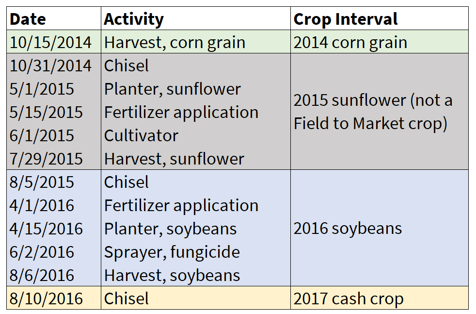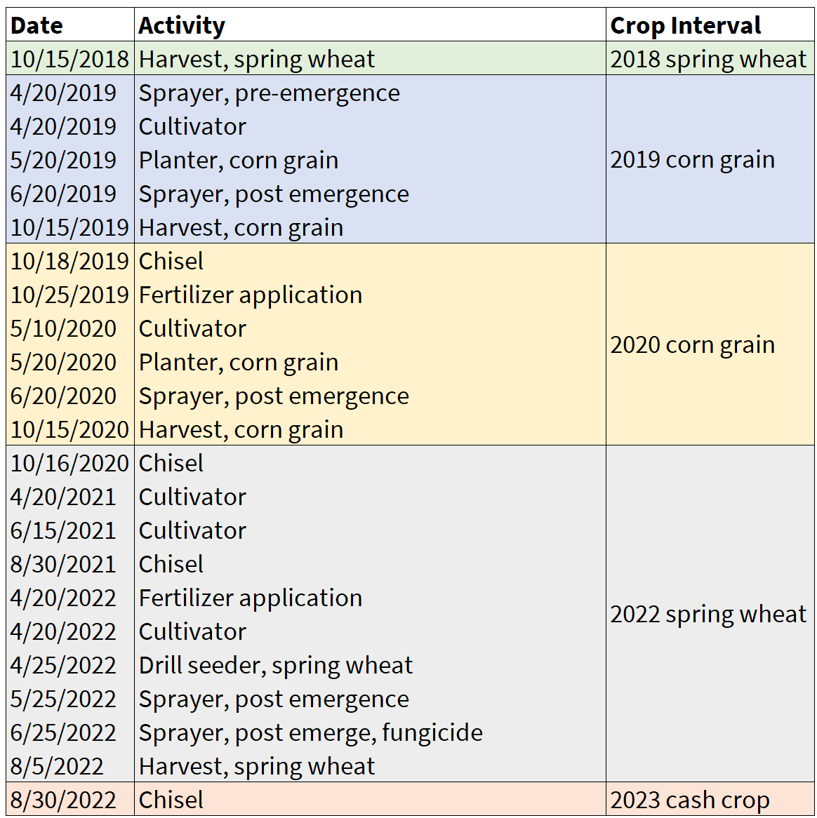 In the example above, 2021 is a fallow year with multiple light tillage passes to control weeds. The 2022 spring wheat crop interval spans two years. For the crops with complete information shown above, the crop intervals would be delineated as follows: