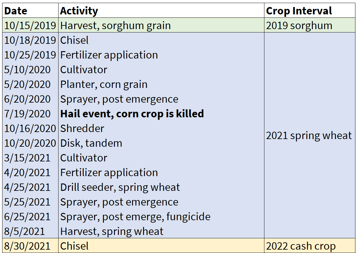 In the example above, the 2020 corn crop suffered a hail event that killed the growing crop (the event is shown in bold font). The grower shredded and incorporated the corn biomass into the soil and returned in the 2021 season to grow spring wheat. The energy use and GHG emissions associated with the failed corn crop are attributed to the 2021 spring wheat.