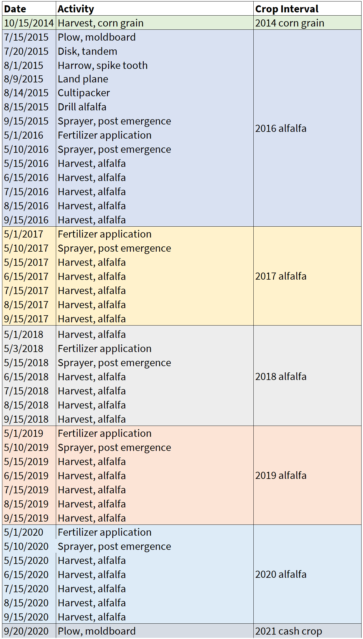 The following figure demonstrates the crop intervals for a rotation with alfalfa. To be concise, many field activities were omitted from the timeline of operations. Alfalfa was planted in August 2015, and the first harvest occurred in the spring of 2016.